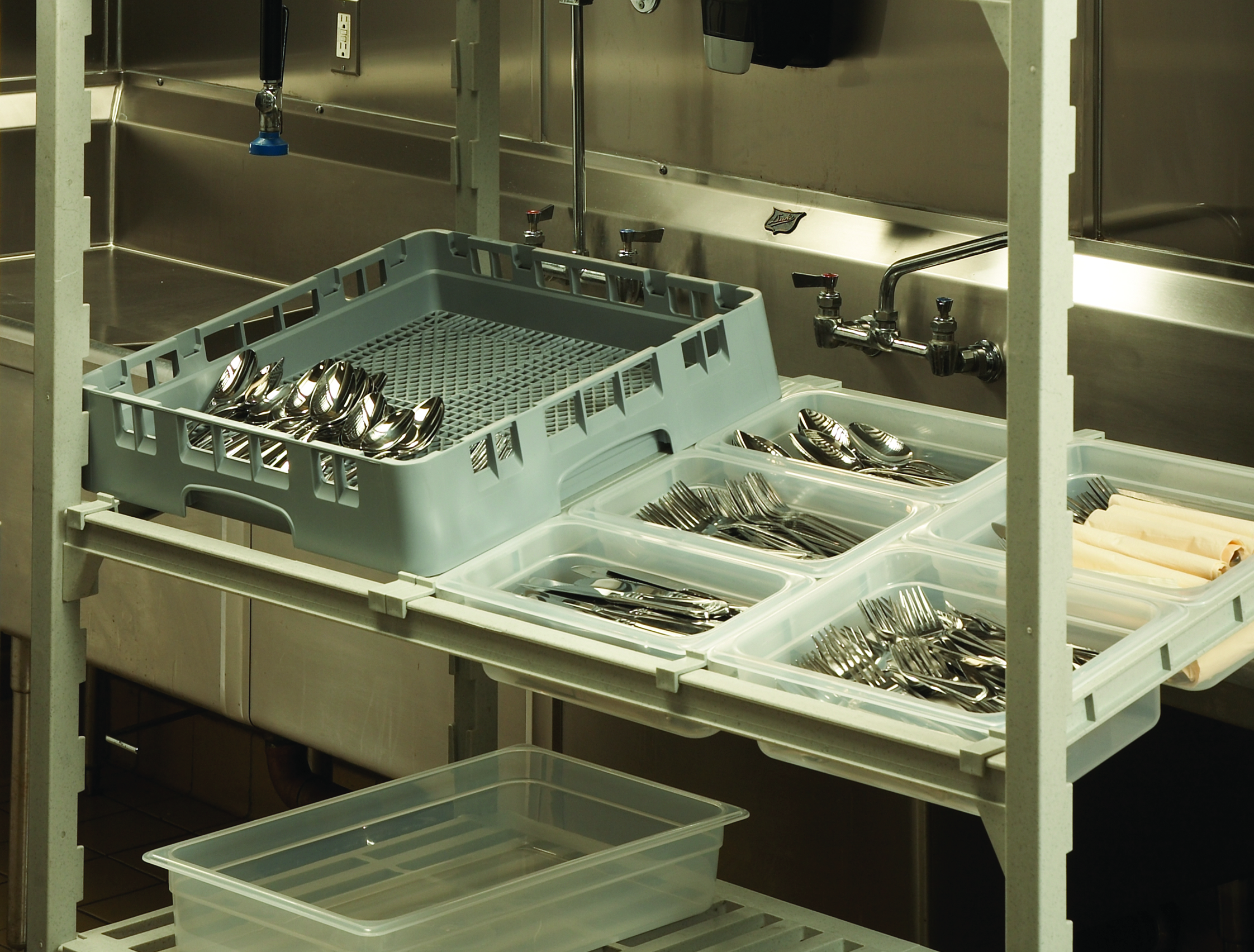 Kosz do mycia sztućców i przyborów kuchennych w systemie Camrack Cambro. Konstrukcja kosza umożliwia umycie różnej wielkości sztućców. Wewnętrzna kratka sprzyja obiegowi wody i sprzyja szybkiemu suszeniu. Kosz wykonany jest z wytrzymałego polipropylenu, który jest niezwykle odporny na działania chemikaliów oraz na temperaturę do 93,3 stopni Celsjusza. Gładko zakończone krawędzie boków oraz bolców sprawiają, że kosze można układać jeden na drugim. Dodatkową zaletą są dopasowane boki zapewniające komfortowe przechowywanie a gładkie boki i zaokrąglone krawędzie zwiększają bezpieczeństwo. Cztery ergonomiczne uchwyty z każdej strony podstawy ułatwiają przenoszenie całego kosza.