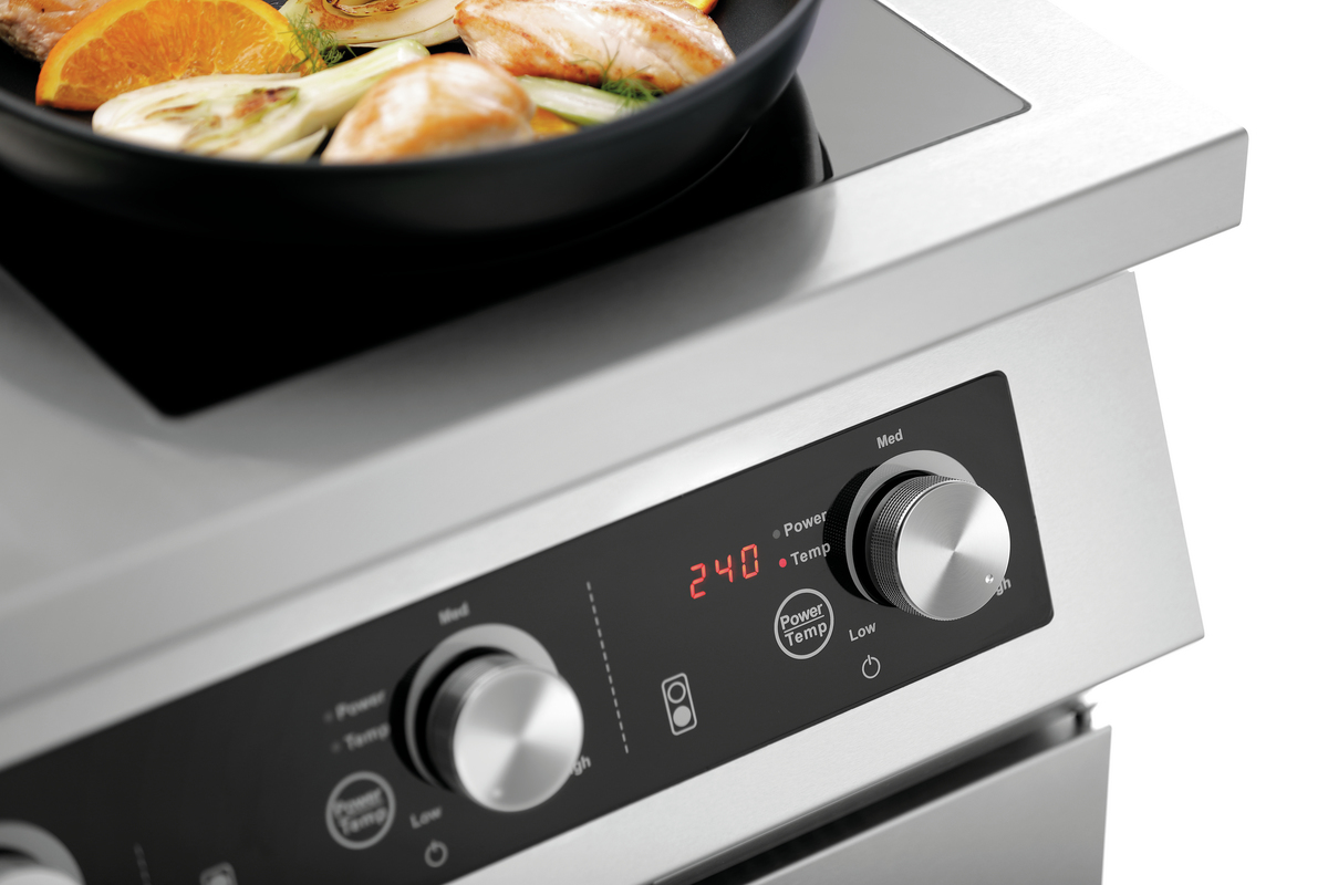 Dzięki 4-palnikowej kuchence indukcyjnej GU zyskasz niezawodnego partnera w kuchni, który zapewni dostateczną moc. Dzielone, szklane pole grzewcze zapewni rewelacyjną przestrzeń do pracy, a całkowita moc 17 kW może być sterowana za pomocą stopni mocy lub temperatury.
