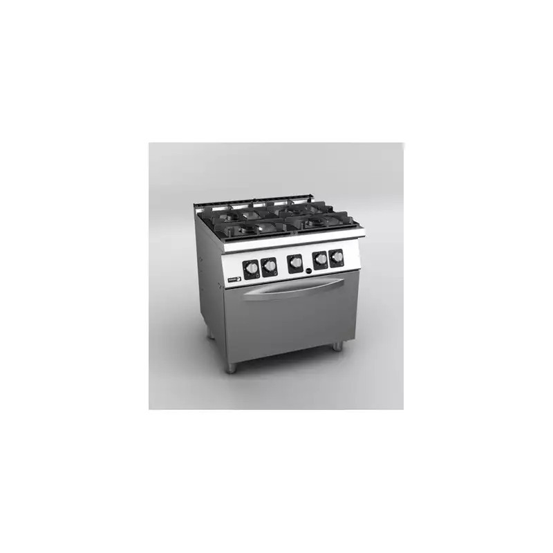 Głęboko tłoczone blaty wykonane ze stali nierdzewnej AISI-304 o grubości 1,5 mm. Podwójne ruszty o wymiarach 397 x 580 mm (397 x 290 mm na każdy palnik), umożliwiające stosowanie dużych garnków i patelni. Zmniejszona odległość 75 mm między środkowymi prętami umożliwia stosowanie garnków o bardzo małej średnicy (8 cm), unikając ryzyka przewrócenia się mniejszych naczyń. Palniki wykonane są z żeliwa emaliowanego RAAF (odporne na produkty alkaliczne i kwasowe, ogień i wysokie temperatury). Palniki i dyfuzory z podwójną koroną wykonane z niklowanego żeliwa, które gwarantują równomierne rozprowadzenie ciepła z płomienia do podstawy naczyń, nawet w przypadku dużych naczyń. Elastyczne rury gazowe ze stali nierdzewnej, ułatwiające wewnętrzne manipulacje w celu ułatwienia napraw. Dostęp do komponentów serwisowych od przodu.Cztery palniki na blacie o zwięszonej mocy, umożliwiające stosowanie różnych garnków i patelni oraz różnych potraw: 4 x 8,0 kW (Ø 120 mm). PIEKARNIK GAZOWY Z WYMIARAMI GN-2/1. Komora piekarnika wykonana w całości ze stali nierdzewnej, Moc grzewcza 8,60 kW. Zawór termostatyczny do kontroli temperatury (125 – 310 ° C).