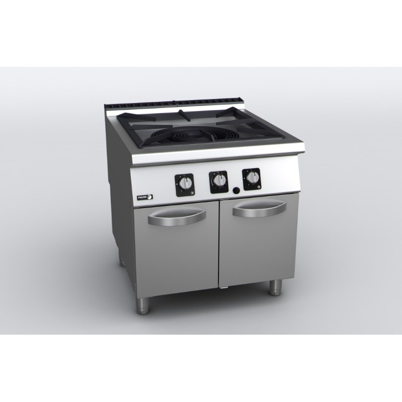 Dwuczęściowy palnik nawierzchniowy (zewnętrzny i wewnętrzny pierścień), zapewniający dużą moc i sprawność. Każda część palnika sterowana za pomocą niezależnego pokrętła. Moc zewnętrznego pierścienia wynosi 11,0 kW, natomiast wewnętrznego 5,5 kW. Nawierzchniowy ruszt o wymiarach 850 x 700 mm wykonany ze stali nierdzewnej. Rynny ociekowe pod palnikiem na tłuszcze łatwo wyjmowalne stanowią integralną część urządzenia. Piekarnik o wymiarach 730x730x330, pilot i termopara, Piekarnik sterowany termostatem w zakresie temperatur 130–350°C.