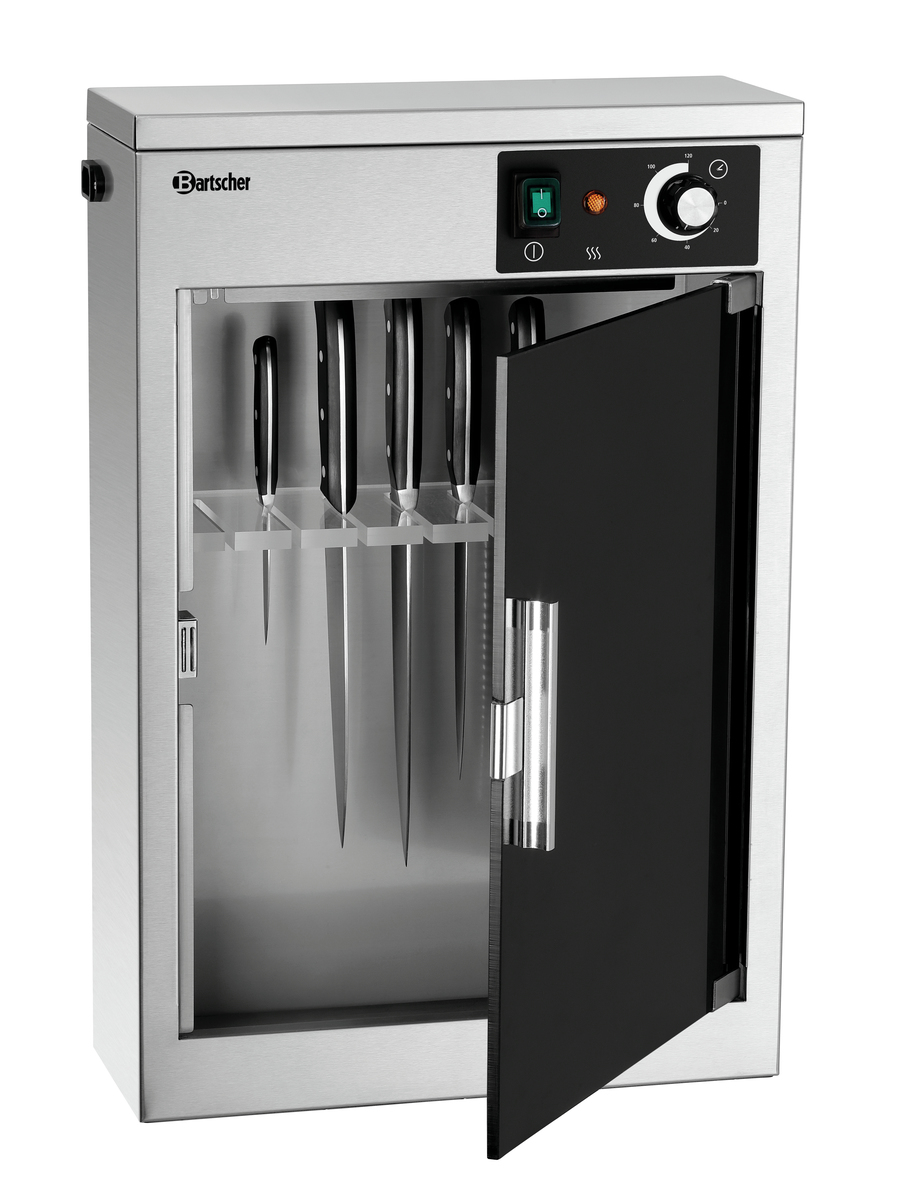Higiena i bezpieczeństwo: barwiona na czarno szyba chroni przed światłem UV, które służy do sterylizacji nawet do 9 noży. Wystarczy zawiesić noże, zamknąć drzwi i ustawić timer.